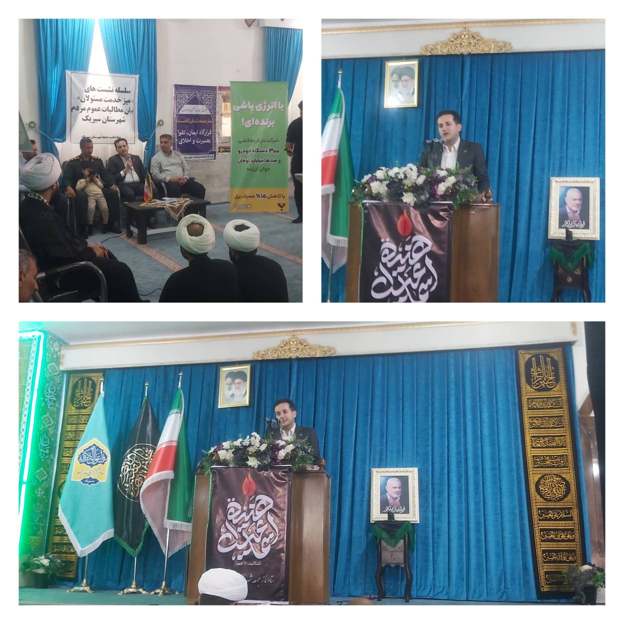 سخنرانی مدیرعامل شرکت شهرکهای صنعتی هرمزگان پیش از خطبه نماز جمعه و همچنین برپایی میز خدمت با حضور مدیر عامل و معاونین این شرکت در مصلای شهرستان سیریک