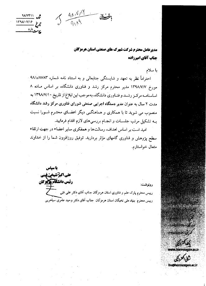 رئيس دانشگاه هرمزگان با صدور حکمی؛ «سيد امير اميري زاد» را به عنوان مديردستگاه اجرايي صنعتي شوراي فناوري مركز رشد دانشگاه هرمزگان منصوب کرد.